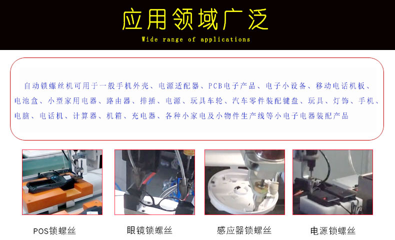 主要应用于一般手机外壳、电源适配器、PCB电子产品、电子小设备、移动电话机板、电池盒、小型家用电器、路由器、排插、电源、玩具车轮、汽车零件装配等小电子电器装配产品