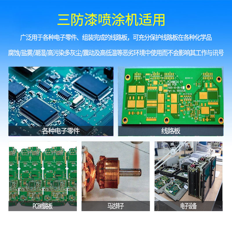 三防漆自动涂覆机设备主要用于产品生产制造行业中线路板表面工艺中的胶水、油漆以及其他液体精确喷、涂、点滴到每个产品精确位置,是专门对流体进行控制,在PCB表面盖上一层三防漆,如用浸渍、喷涂或旋涂等方法在PCB表面覆盖一层光致抗蚀剂。可以用来实现画线、圆型或弧型,可以有效保障产品喷涂的一致性,节省成本,生产更高效。